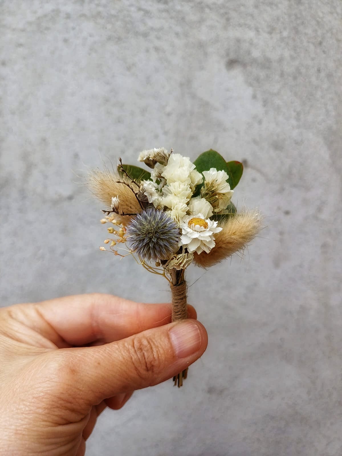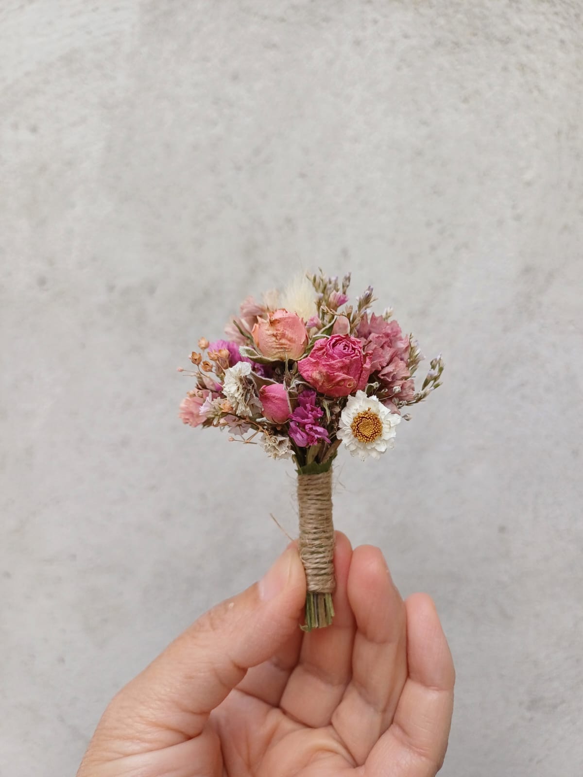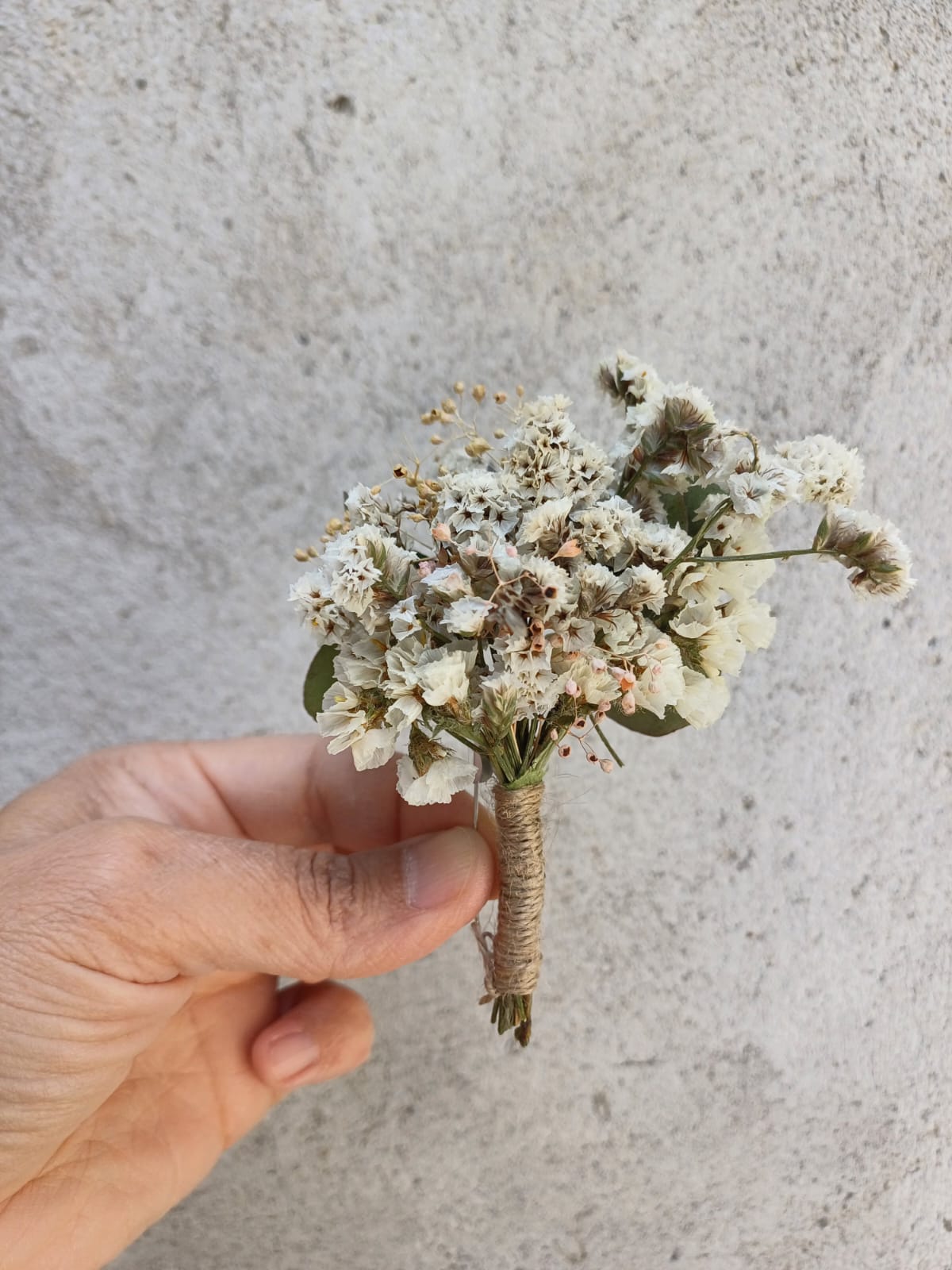 El boutonnier de flores secas permite una versatilidad de colores que pueden ir del blanco, amarillo, rosado, celeste, violeta, azul.