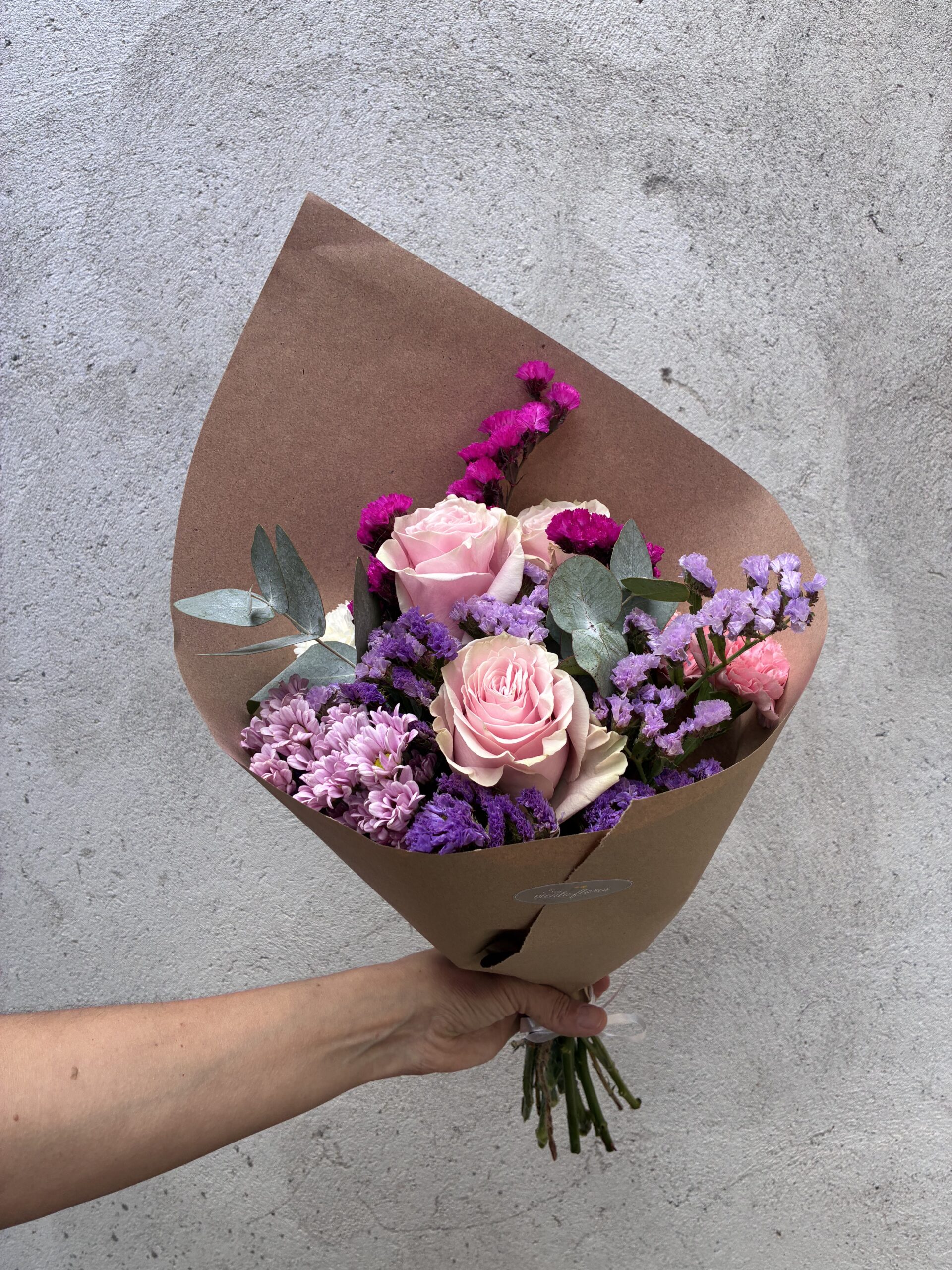 Ramo chico de rosas importadas con follaje y flores delicadas de estación. Es el detalle perfecto para regalar o para decorar.